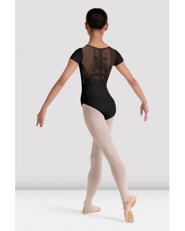 El maillot para danza Mei Floral con mangas tipo capa, presenta un escote de malla suave en forma de scoop con detalle de corazón y una espalda de malla laboriosamente bordada.
